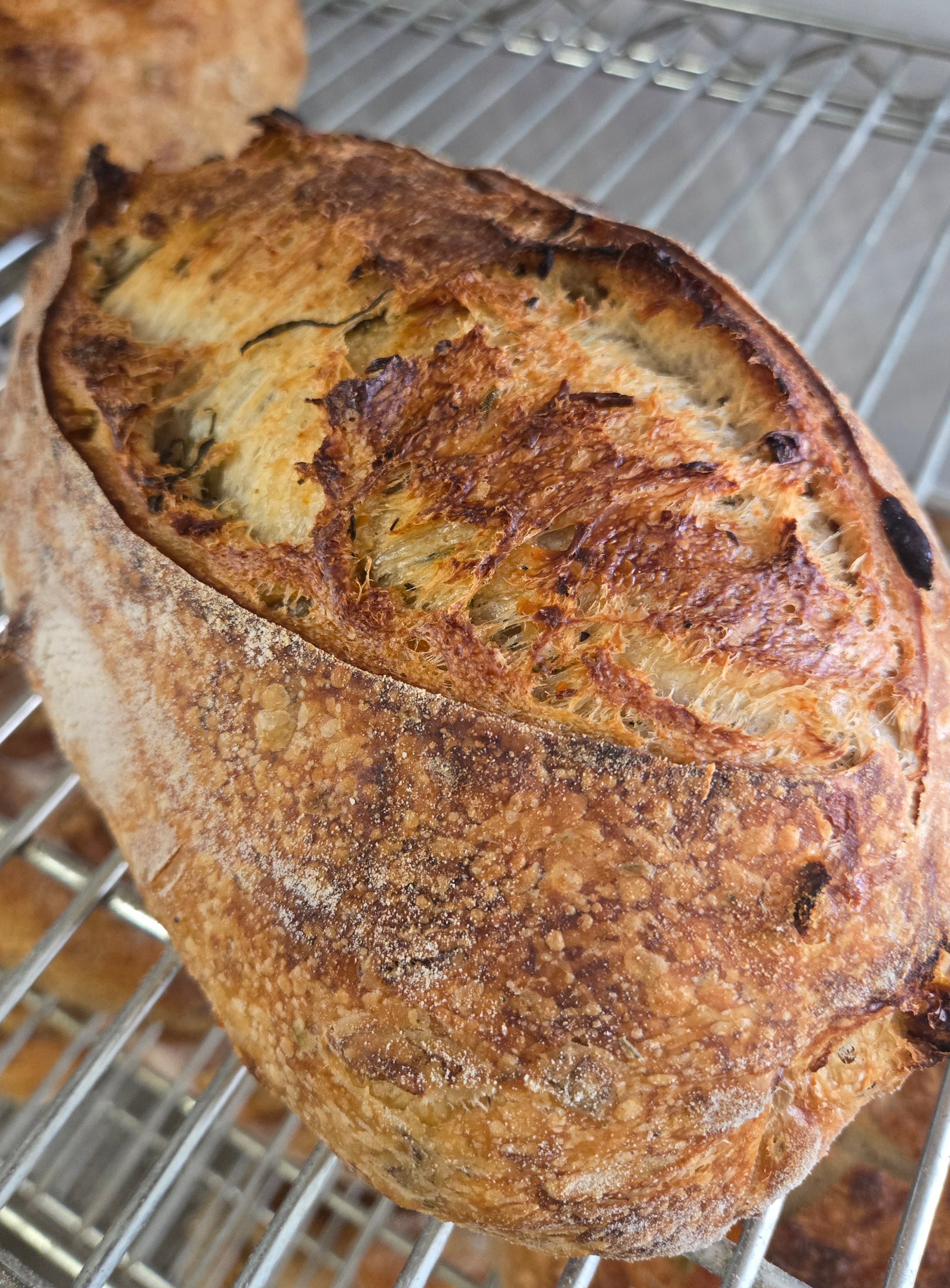 Sourdough bread meets pizza night! This savory loaf is packed with kalamata olives, parmesan, fresh basil, oregano, and rosemary. Slice, top with your favorite sauce and cheese, and toast it up!